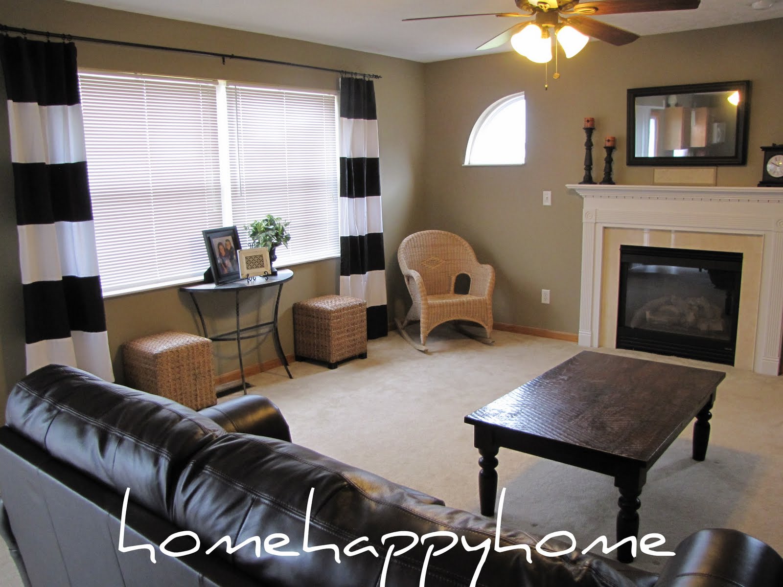 My next project for the room was to find the perfect curtains. I did a lot of shopping via foot and Internet and couldn't find anything I loved that was in my teeny tiny budget! While roaming online I found a tutorial to make black and white striped curtains at http://www.theyellowcapecod.com/ . THANK YOU THANK YOU this was just what I had been looking for! Unfortunately for me I can't sew, at all (no kidding)! So I decided to do what I'm good at, PAINT! I bought cheapy white cottton curtains at Target (my favorite store) for less than $20.00 for the pair. I then had to decide how many stripes I wanted and what size. I decided I wanted wide stripes 12 inches each. Please note this project was relatively easy but a little time consuming. I laid the panels on the floor and used a measuring tape to measure my 12 inches and marked along with a pencil. Once I had all the stripes marked I used frog tape along my marks to make a straight line. I made sure to press the tape firmly along the edges to avoid bleeding. I did this project on my kitchen floor because of the paint. I would suggest using a painters dropcloth or plastic under the curtains when painting ( I may have had some black stripes on my kitchen floor when I finished)! I used a simple inexpensive mini paint roller and just painted away. I made sure to remove the tape after completing each stripe so the paint wouldn't dry and peel off. I let them dry for an entire day before hanging them up. Once hung I did have to go back with a small paintbrush and go over some spots that I missed or didn't absorb enough paint. I'm so glad I didn't chicken out and went ahead with this project! I am loving how our family room is coming together!